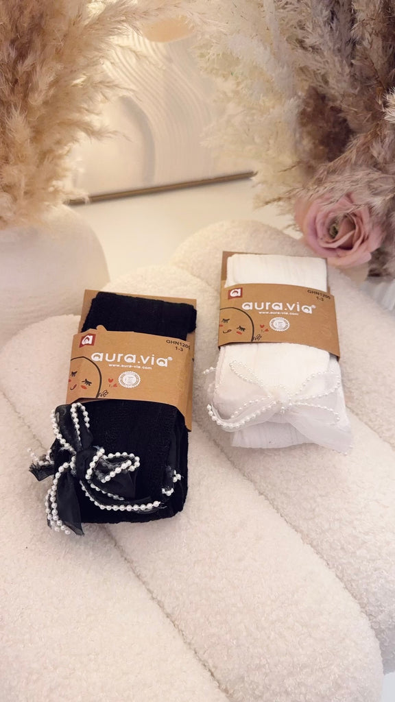 These thick cotton-blend tights, available in black or white, feature delicate ribbon and pearl-lined bows for a refined touch.