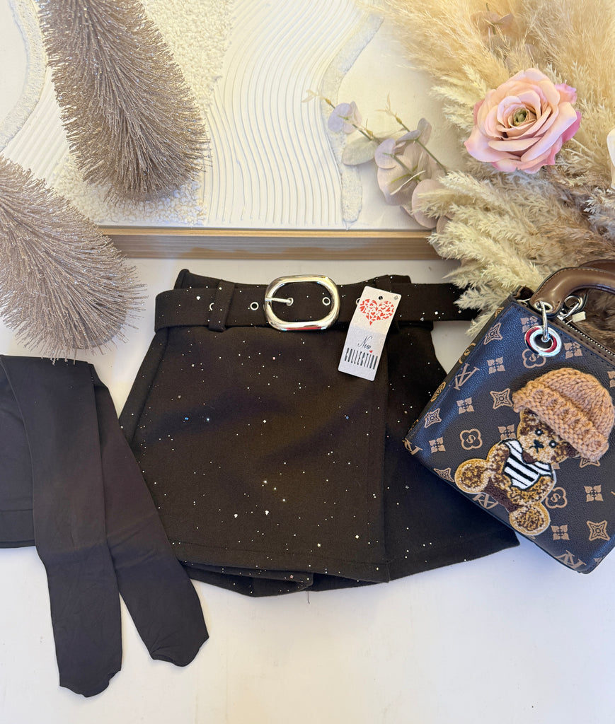 Crafted from thick chocolate fabric with built-in sparkle and a bold chunky belt buckle, these skorts turn a simple outfit into an instant statement.
