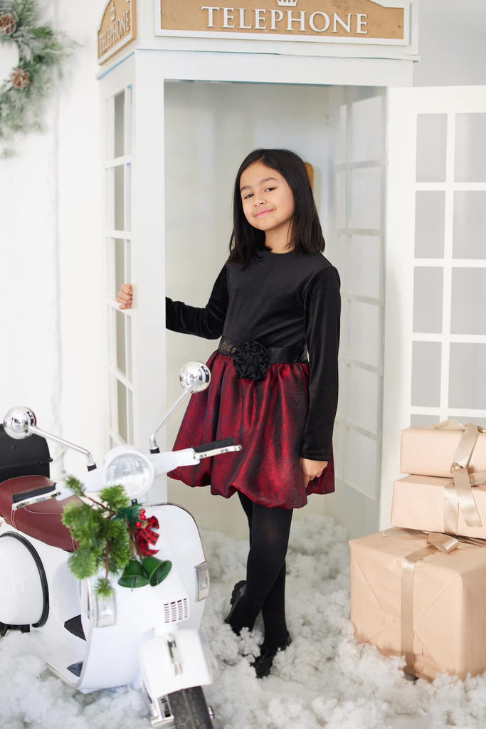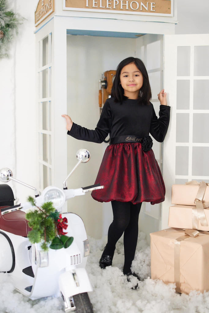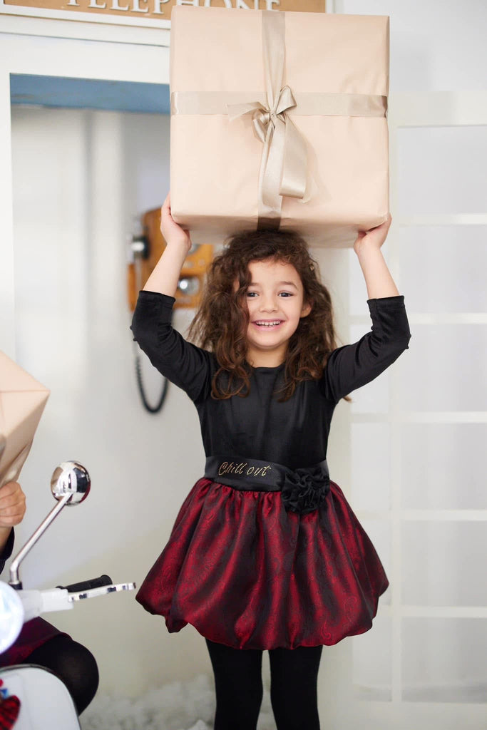 Deep festive tones and a bold, twirly silhouette make this the ultimate Christmas fit.