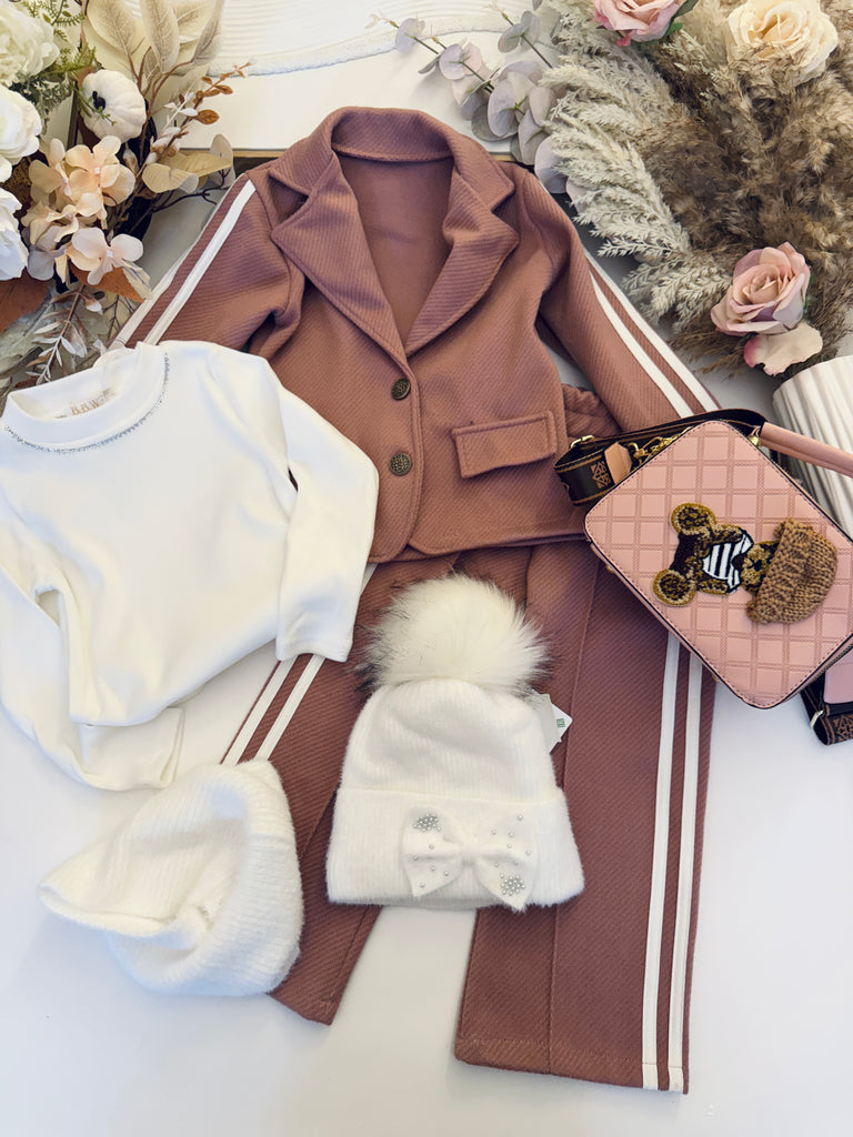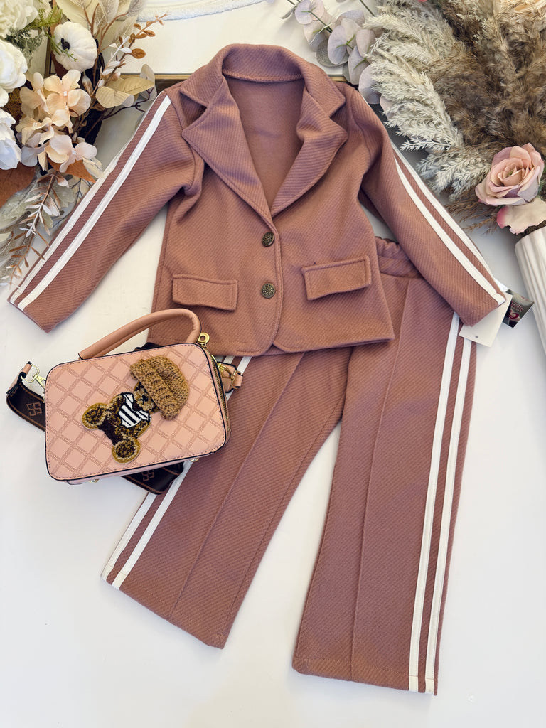 This deep pink two-piece set pairs a thick blazer and trousers, both finished with eye-catching double white stripes for a bold, polished vibe.