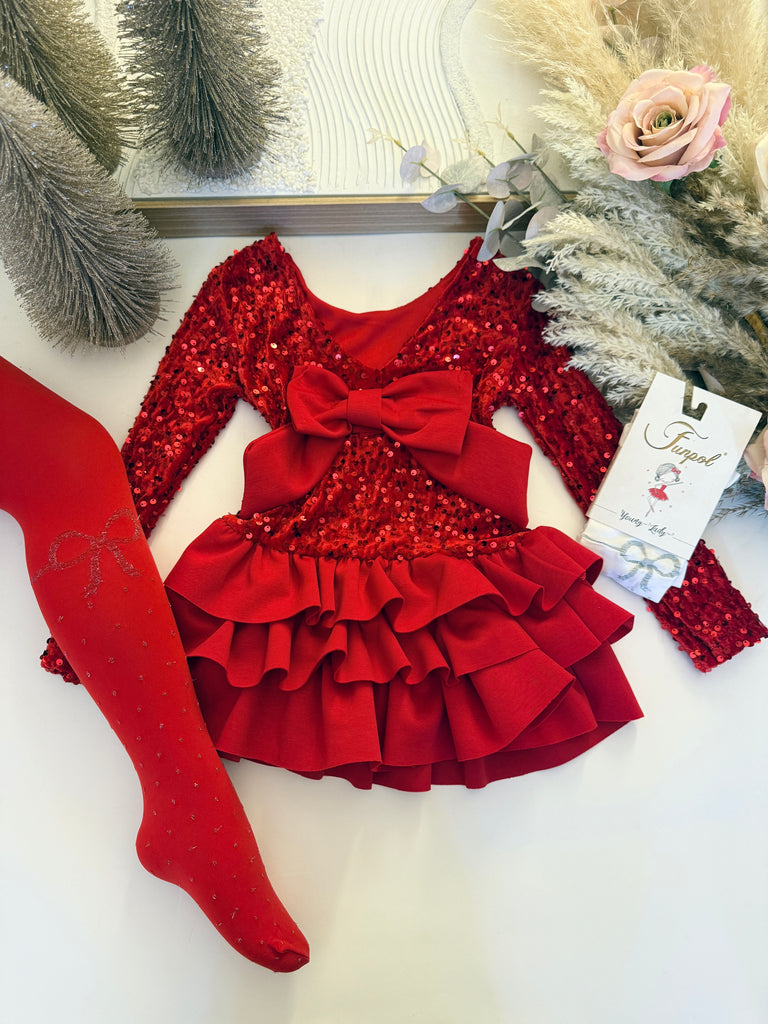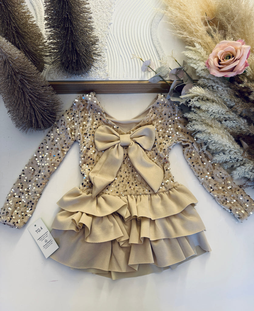 This ong sleeve dress is fcovered in sequins and finished with a layered frilled bottom, turning every step into a statement.