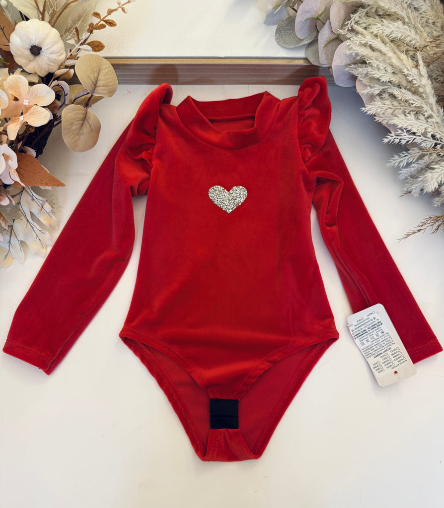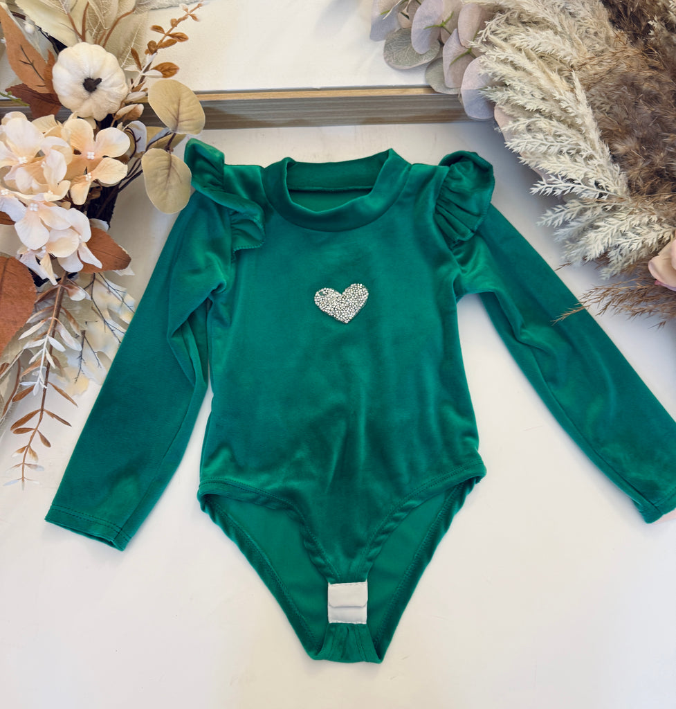 These rich red or green bodysuits are crafted from warm, luxe velour and finished with sequin heart accents on the chest — made for festive nights and standout moments.