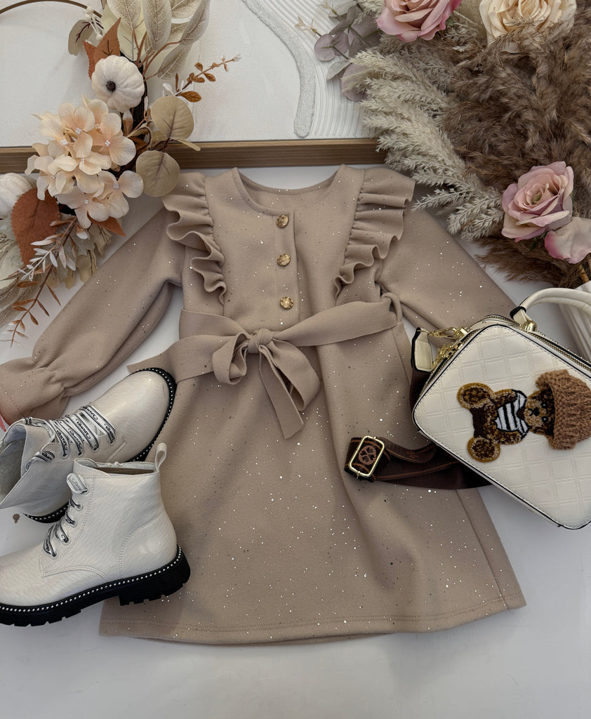 Beautiful long sleeve warm material dresses, featuring cute frilled shoulders and in built in wow factor sparkle.