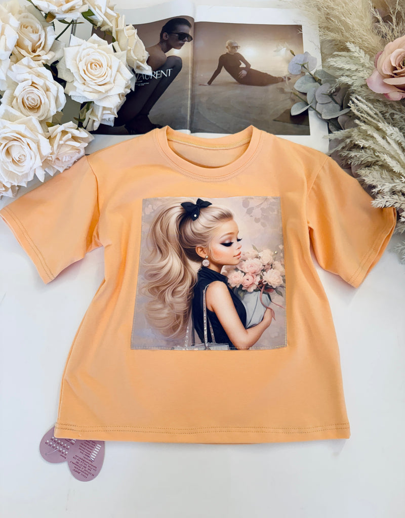 Soft, stylish, and effortlessly glam. This peach tee features a stunning illustrated girl with a high ponytail and bouquet of blush blooms, giving major classy vibes. Comfortable with an easy fit, it’s perfect for everyday wear while still making a statement.