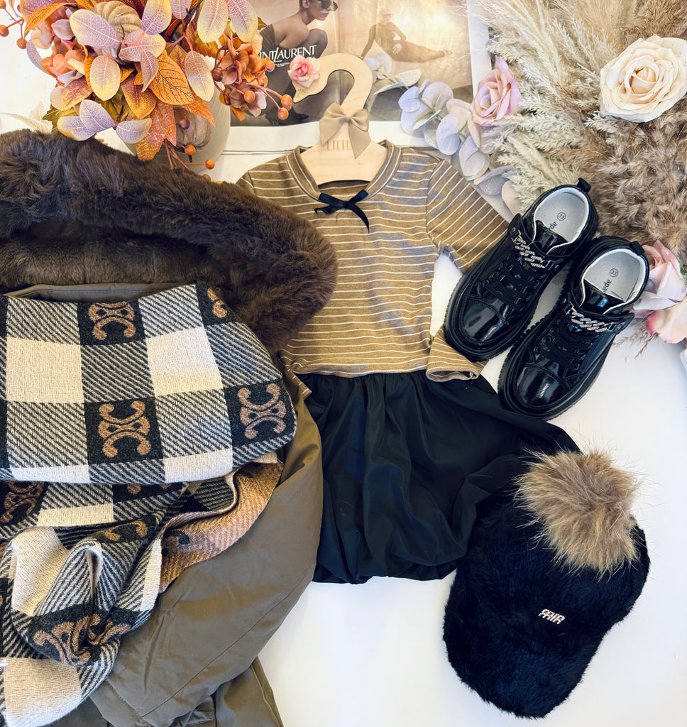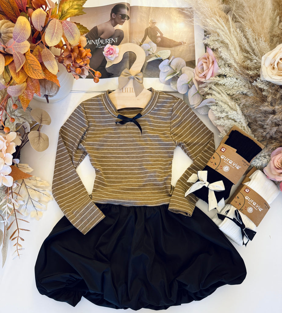 Beautiful long sleeve striped combo dress featuring a stylish black bubble skirt.