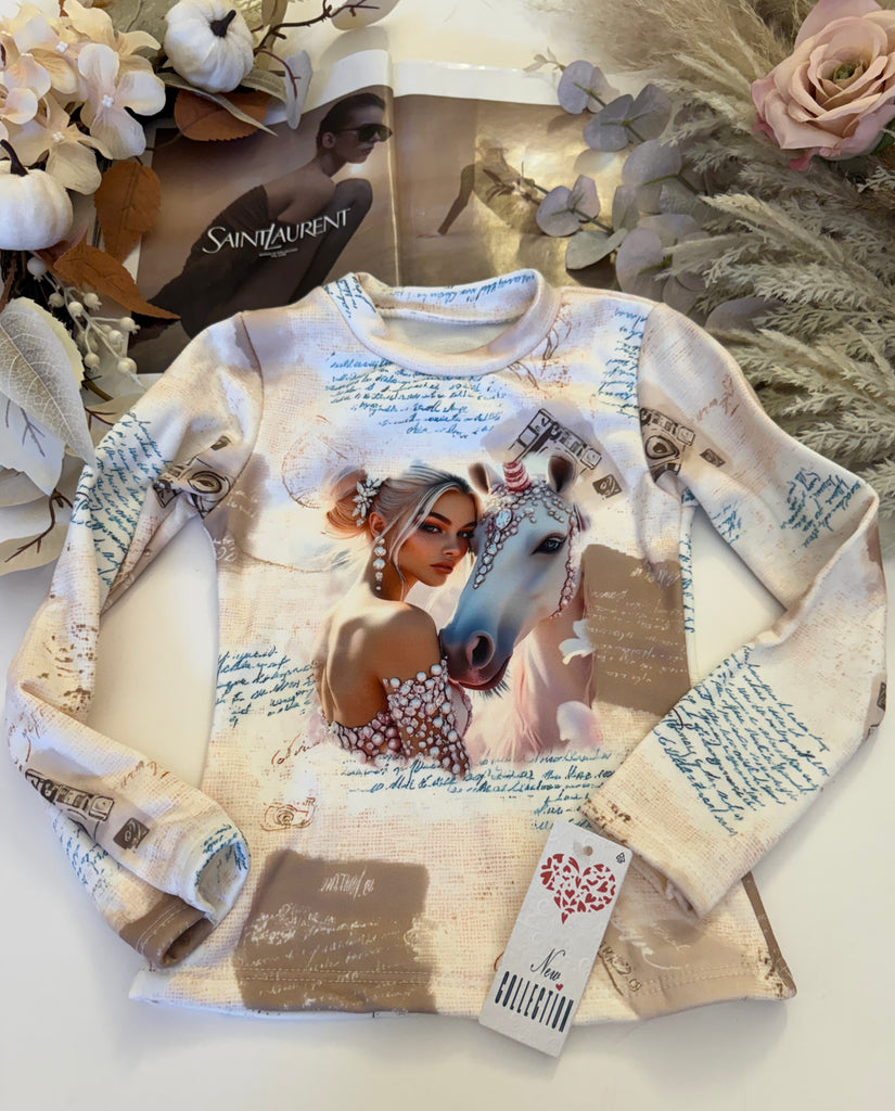 - Designs: Each top features a unique print of a girl with a horse, combined with decorative patterns and script elements for a trendy look.