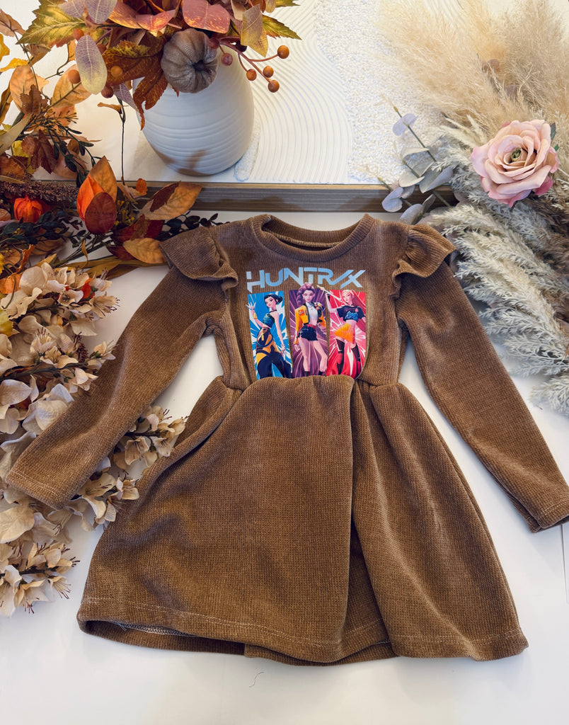 Warm, soft dresses in beige, pink, or caramel, printed with the Huntrix K-Pop Demon Hunters graphic for a fierce, standout look.