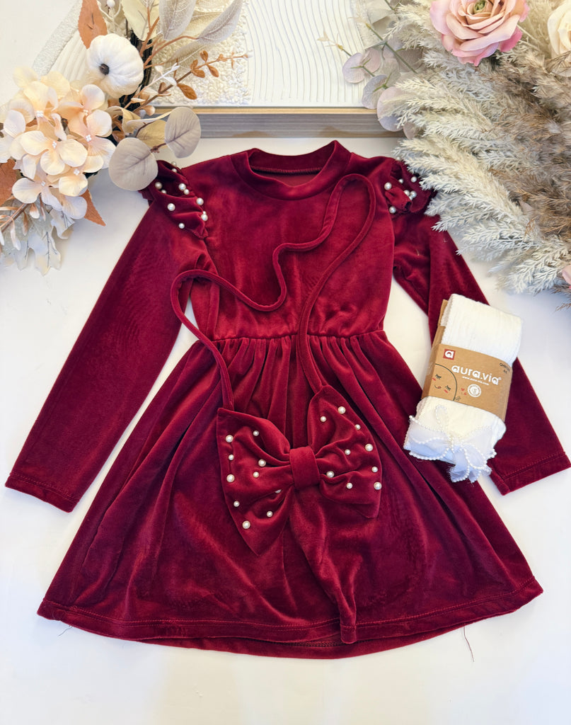 Long sleeve velour dresses in deep green or maroon feature frilled shoulders adorned with pearls, and come with a matching accessory bow, also embellished with pearls, for that perfect festive touch.