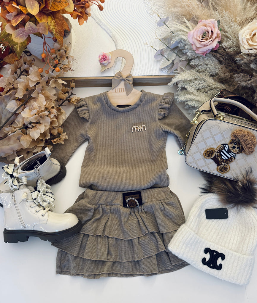 A warm long sleeve top with delicate frilled shoulders and a sparkling Miu pin badge on the chest for subtle shine.