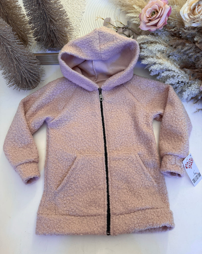This zip-up hooded jacket is made from luxe Boucle material and features a playful teddy patch on the back, adding just the right touch of street style.