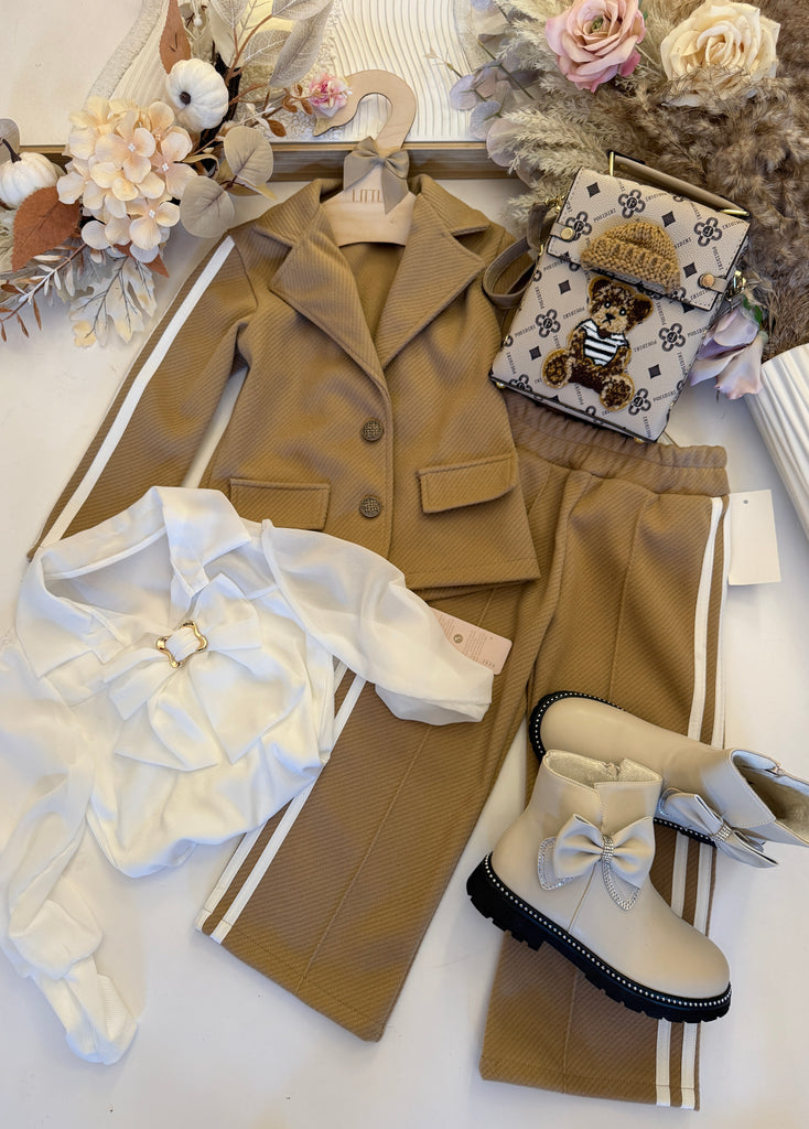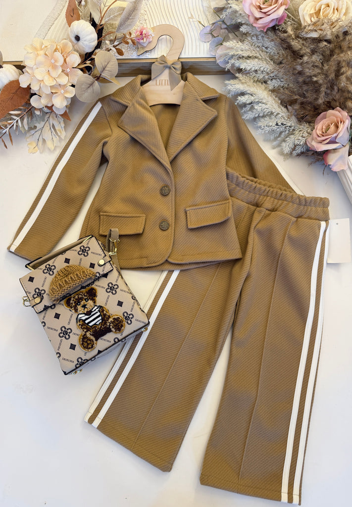 This deep pink or caramel two-piece set pairs a thick blazer and trousers, both finished with eye-catching double white stripes for a bold, polished vibe.