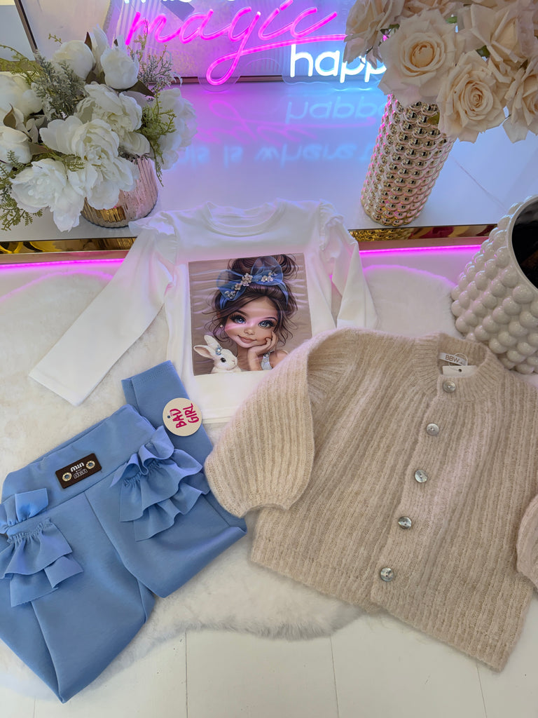 Soft, sweet, and made to stand out. This cream long-sleeve top features a stunning illustrated girl with piercing blue eyes, a delicate blue bow headband, and her adorable bunny companion.