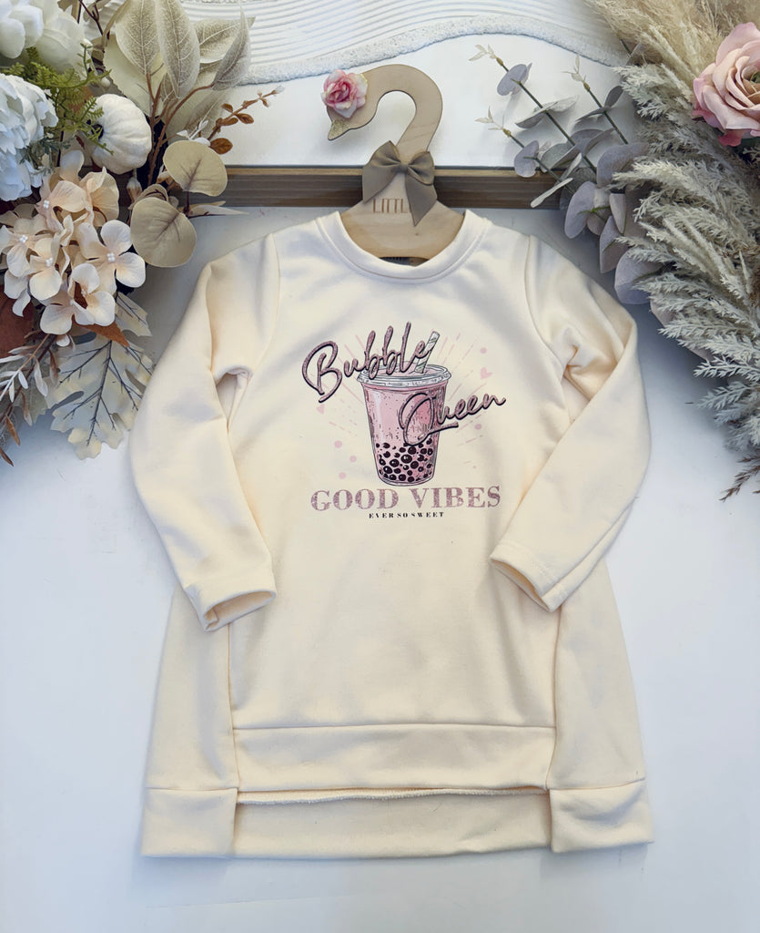 Super cute long sleeve vanilla coloured top featuring cool bubble tea print.