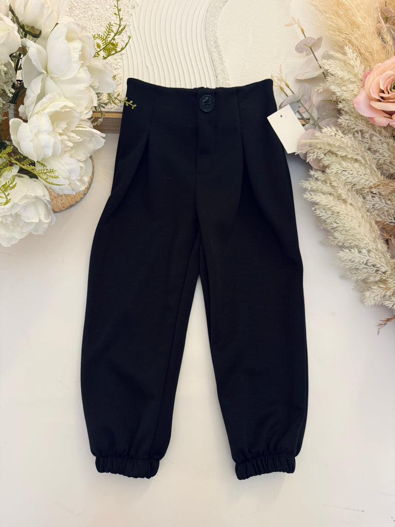 girls’ jogger-style trousers with a soft elastic waistband, button detail, and elasticated cuffs—comfy, polished, and easy to dress up or down.